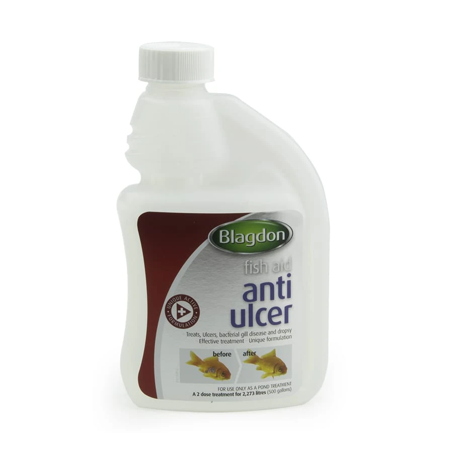 Blagdon Fish Aid Anti-Ulcer is a 2 dose treatment for Ulcers, Bacterial Gill Disease & Dropsy organisms on ornamental pond fish. Symptoms include ulcer sores, pop eye (swollen eyes), dropsy (swollen body, pine cone appearance), hollow belly gill rot (fish gasping) and unexplained fish deaths. Harmless to filters and all species of pond fish, plants and water using wildlife.