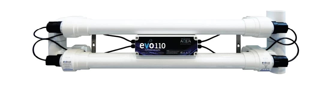 The Evolution Aqua evo110 is designed differently to the other models in the range, as the two 55 Watt bulbs run in parallel throughout a fully robust white PVC casing with connections ready to fit to 2 inch pipe. This design means the evo110 UV meets the needs of both domestic and commercial installers looking for great reliability and an efficient, economical performance.