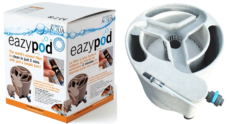 The Evolution Aqua EazyPod is the complete mechanical and biological filter system for garden ponds up to 20,000 litres or koi ponds up to 10,000 litres. Utilising the famous Nexus Eazy cleaning system combined with the Kaldens K1 filter for a famous “GIN clear”water. The EazyPod is quick and easy to clean by just turning on the air valve.