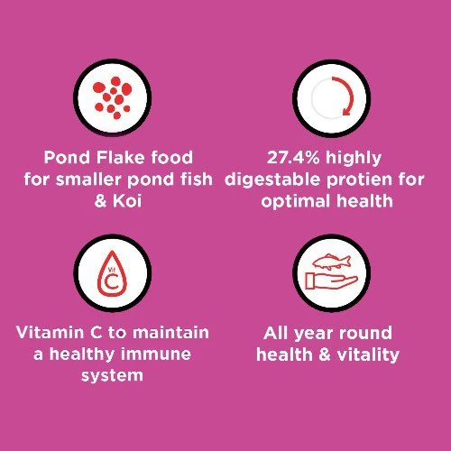 A multi-usage flake specially formulated for all coldwater fish in ponds and aquaria. A highly digestible, low waste diet. Ideal for smaller pond fish, supplementing other diets. 26% protein for growth Stabilised vitamin C Foil sealed for freshness Blended Flakes.