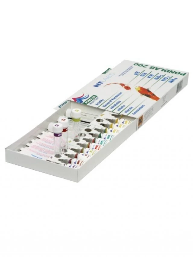 The main factor in successful fish keeping lies in the maintenance of good water quality; pH, ammonia and nitrite levels in the pond should be checked regularly, weekly in a new pond and fortnightly in an established mature pond. The purpose of regular water testing is that poor water chemistry will cause stress to your fish. As the stress levels of fish increase their immunity can decrease making your fish susceptible to pathogenic infections and poor health, and an unchecked build up of nitrate will only fuel the algae growth in your pond. The NT Labs Pondlab 200 Multi-test Kit comprises over 200 tests of the 6 key parameters to test in your pond. Ammonia, Nitrite, Nitrate, pH, GH and KH. All the tests are liquid drop tests from a callobrated dropper bottle so all the drops are the same size. All you have to do is add your aquarium water to the test tube and count the drops needed, simple. The back of the box details clear pictorial instructions so you can see what to do from the start. A booklet of colour coded stickers is provided to label both the test tubes and test tube lids so you always conduct the same test in the same test tube. The reason for this? Well for example the GH reagents may contaminate the test tube and could give you a false reading if you were to conduct an ammonia test in the same tube.