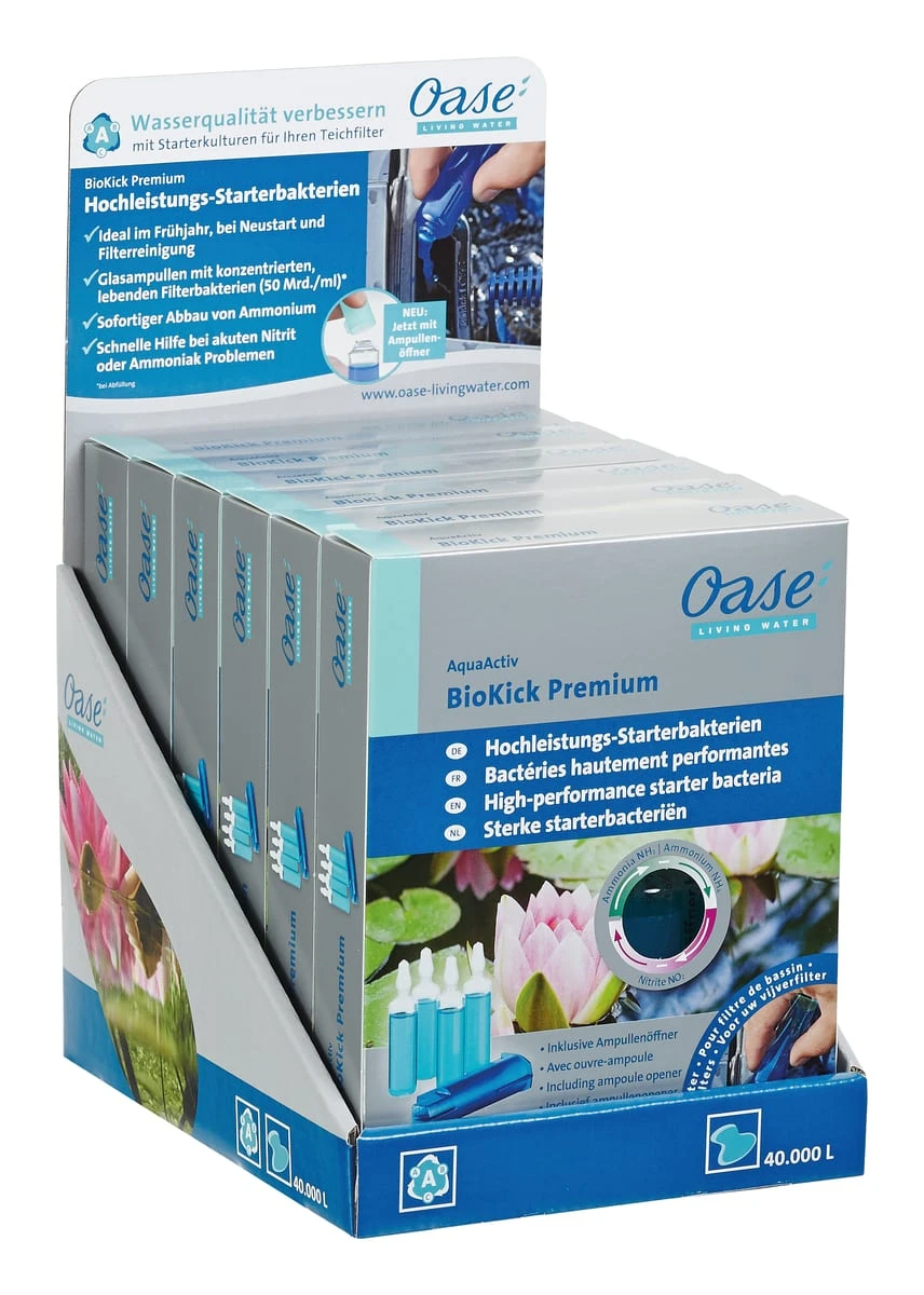 Oase AquaActiv BioKick Premium us a highly concentrated filter bacteria for heavily burdened filter systems. It contains more than 50 million active microorganisms/ml at the time of filling. Ideal for highly stressed ponds, particularly with koi stock.