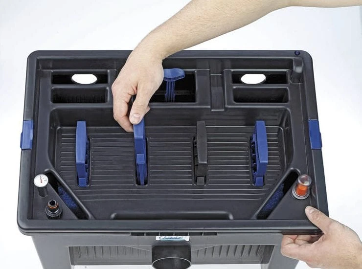 The cleaning handles of the Oase BioSmart Pond Filter and Pump Set enable convenient filter foam cleaning, without removal from the filter. The integrated pollutant level indicator signals the right time for cleaning. Eliminate algae and reduce pathogens and pollutants for a thriving pond.
