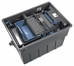 More convenience, thanks to automatically driven self cleaning of the belt filter. Adjustable Cleaning Sensor controls the belt run, depending on the degree of pollution. Includes LED function check. Cleaning of filter sponges directly in the filter, without removal. Sludge drain with slide valve for removing debris from the filter system.