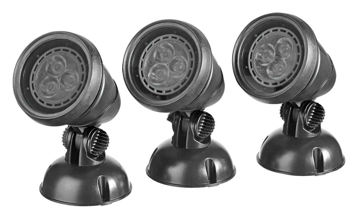 Energy efficient set of 3 LED underwater spotlights that provide a warm white broad beam angle, ideal for plants and other highlights in pond and garden. Protection class IP 68 and has an adjustable head. Length: 242 mm Width: 300 mm Height: 145 mm Cable length 12 V device: 2 (transformer) + 5 m Guarantee: 2 years